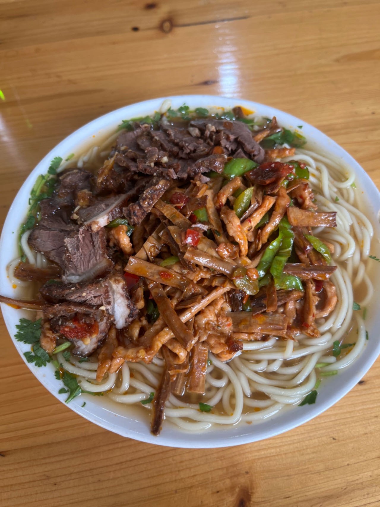 老板娘推荐笋干面加牛肉,我说好,再来瓶迎客松。那是当地啤酒品牌,酒精度只有2.5度。老板娘在里间煮面时,从外面进来一个三十多岁的阴郁男子,径自走到冰柜,拿了瓶啤酒,在操作间外面的桌子上坐下来,和我之间有几张桌子。我和老板娘隔着玻璃隔断聊马拉松时,他一边刷抖音一边对瓶吹,始终没看我一眼,也未插一言。但有次突然擤鼻涕,直接冲着地面,像是马打了个响鼻。擤完也没起身洗手,甚至没用纸擦一擦,继续刷他的抖音。我心里一沉,转念安慰自己,反正也不是他煮的,他看起来连厨房也不会进。然后,他就进了厨房。那时,正好有人打电话,老板娘走到外边来接电话,他便在里边代替她。看动作,像是捞面。我几乎眼前一黑,想要拔腿就跑。可是跑不动,也不知道怎么跑。于是继续假装无事发生(这是中国人最在行的技能)。好在,他后来给自己端了一碗出来吃,我那碗,是再后来老板娘端出来的。我以为我吃不下,可是几分钟后,我连汤都喝了个精光。谈不上好吃,大概是身体极度需要碳水。走时我一边跟老板娘说谢谢,一边心想,我要记住这个店,以后再也不要来了。