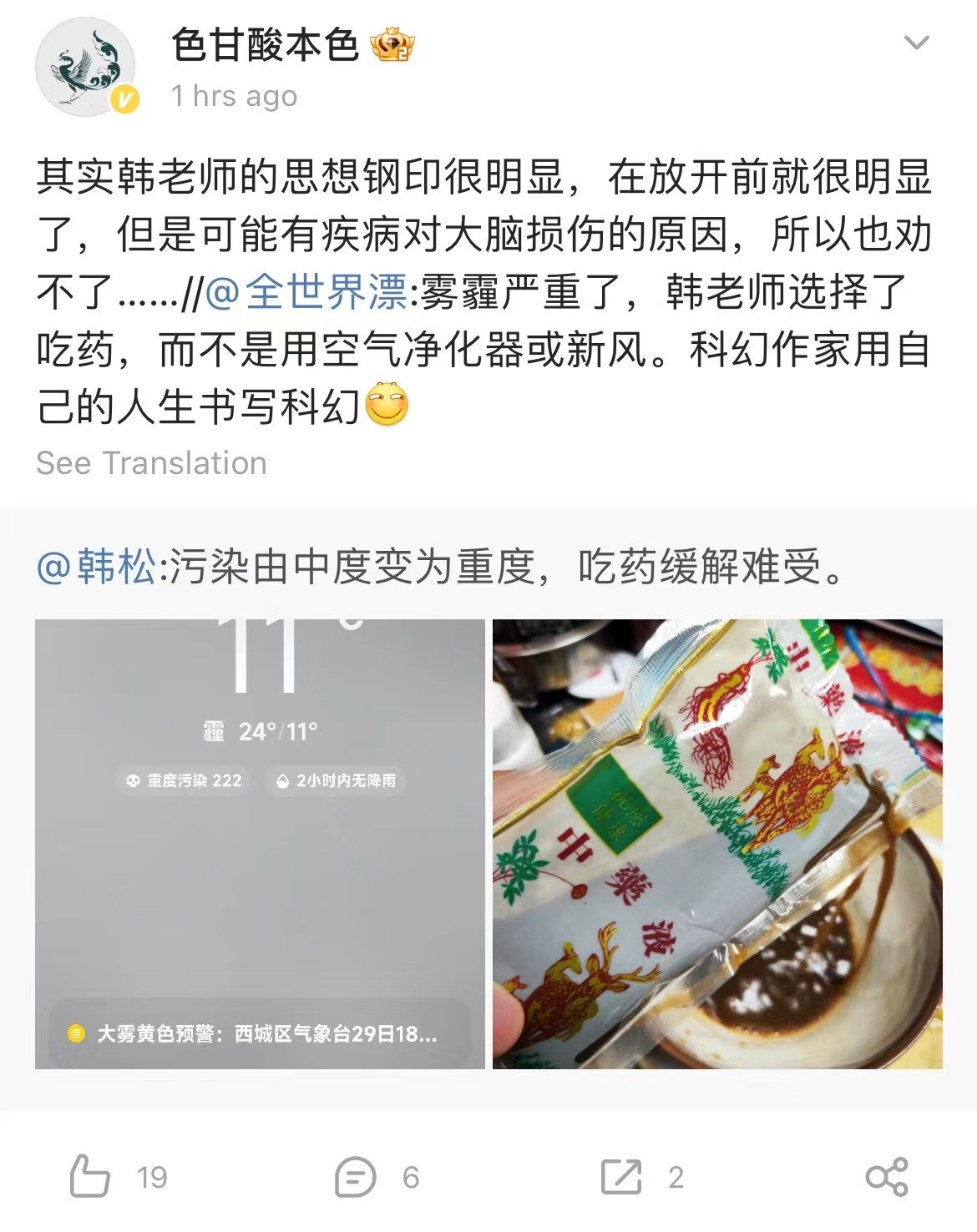清零末期,韩松老师在微博上讲到莲花清瘟的时候,我以为他在阴阳怪气。没想到,他新冠感染之后身体长期虚弱,天天吃中药了。那种药店熬好的袋装药,热水里温一下就能吃的,和他天天吃的各种方便类面食一起晒出来。很多人在评论区劝他,韩老师吃点好的吧,别天天吃面,得补充营养啊。很多人想要给他点外卖,甚至很多人问他要地址,要给他送饭送东西。也有些新粉,劝他不要吃中药,去医院检查。有些人会惊诧:科幻作家怎么信玄幻?就像我有段日子很好奇大科学家们为啥会信上帝一样。
