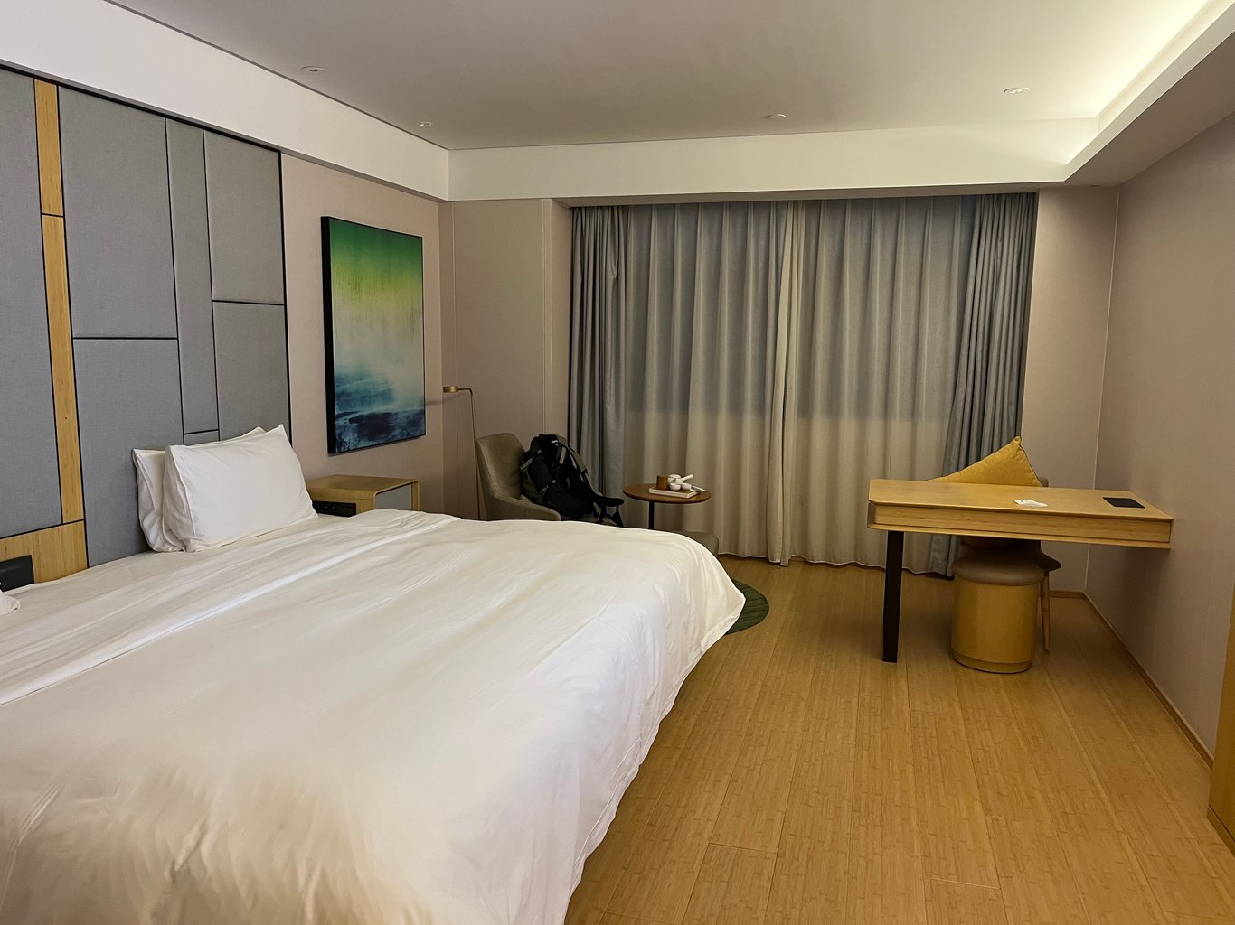 话说那晚住的全季,可能是旅游区,多少有点应付游客,大床房的床是两张单人床拼成的。目测是两张1.5米的单人床,拼后变成3米,能睡四五个人。真浪费,我发了个动态说。有人评论说那被套可不好套。可不是?他们不好套,我也不好盖,晚上想要卷一下被子,只能朝一边,另外一边,卷不到头。
